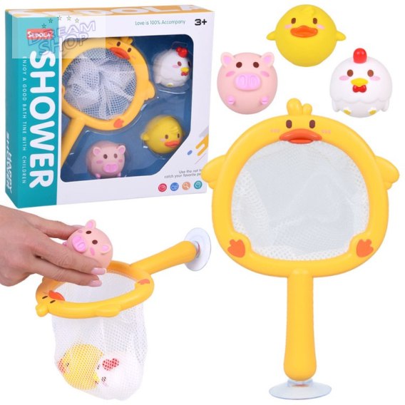 Podbierak do wody, siatka z przyssawką, sitko, zwierzątka, świnka, świnia, kurka, kura, kaczka, kaczuszka, zestaw kąpielowy, do kąpieli, do wanny, do łowienia zwierzątek, łowienie, okrągłe zwierzątka piłeczki
