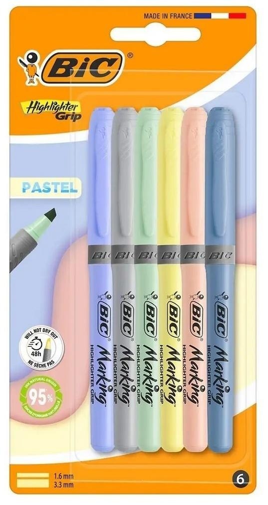 Zestaw zawiera 6 zakreślczy BIC Highlighter Grip Pastel z tuszem w 6 modnych pastelowych kolorach: żółtym, zielonym, fioletem, niebieskim, szarym i pomarańczowym. Idealny do fotokopii. Korpusy posiadają rowkowany gumowy uchwyt, który zwiększa wygodę użytkowania. Tusz na bazie wody nie przesiaka przez papier i w 95% ma naturalny skład (w przypadku żółtego i zielonego w 80%). Zakreślacze mają modułową, ściętą końcówkę, która pozwala zarówno na szerokie podkreślanie, jak i precyzyjne podkreślanie cieńszymi liniami; doskonale nadają się do rysowania, kolorowania i pisania. Dzięki nowoczesnej technologii zakreślacz BIC Highlighter Grip nie wysycha pozostawiony bez skuwki nawet przez 48 godzin.