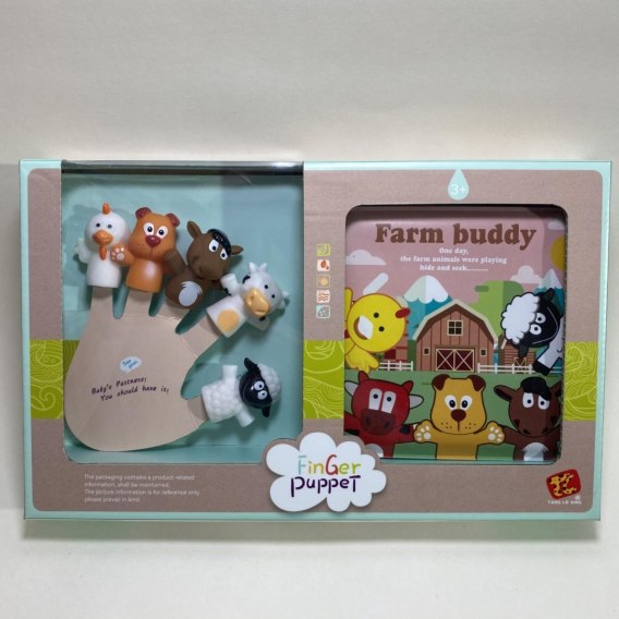 Zestaw gumowych pacynek - zwierzaczków na palce z miękką książeczką o zwierzątkach to propozycja dla dzieci od 3-go roku życia. Pacynki na palce to wspaniała zabawa a zarazem skuteczne narzędzie edukacyjne dla dzieci. Z tym zestawem dzieci lub dorośli będą mogli odgrywać teatrzyki w których głównymi bohaterami będą zwierzęta takie jak kurka, piesek, osiołek, krówka, baranek. Do zestawu dołączona została miękka książeczka z przygodami zwierzaków. Napisy w książeczce są w języku angielskim. Na głównej stronie książki w dolnym prawym rogu znajduje się piszczałka. Książeczka i pacynki są wodoodporne i nie mają ostrych krawędzi. Zabawa pacynkami pozytywnie wpływa na rozwój wyobraźni, motoryki i koncentracji.