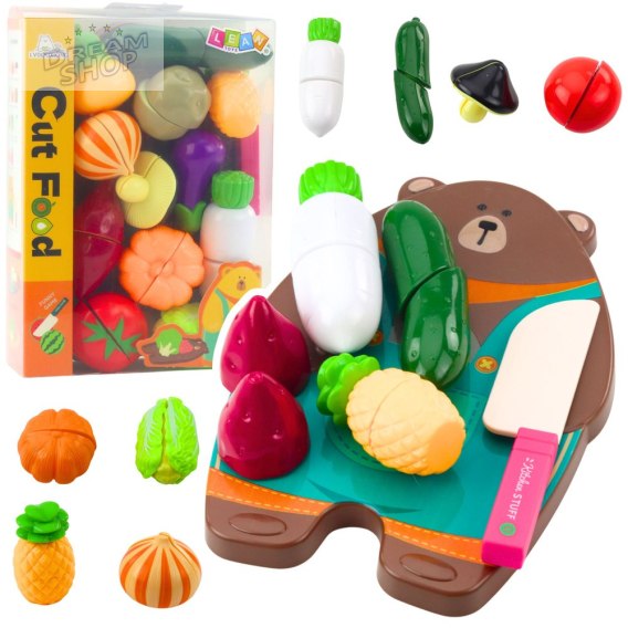 Zestaw do krojenia warzyw to idealna zabawka dla dzieci, które uwielbiają zabawy w kuchnię i naśladowanie dorosłych. W komplecie znajdują się kolorowe warzywa wykonane z wysokiej jakości tworzywa, bezpieczny nożyk oraz deska do krojenia w kształcie misia.