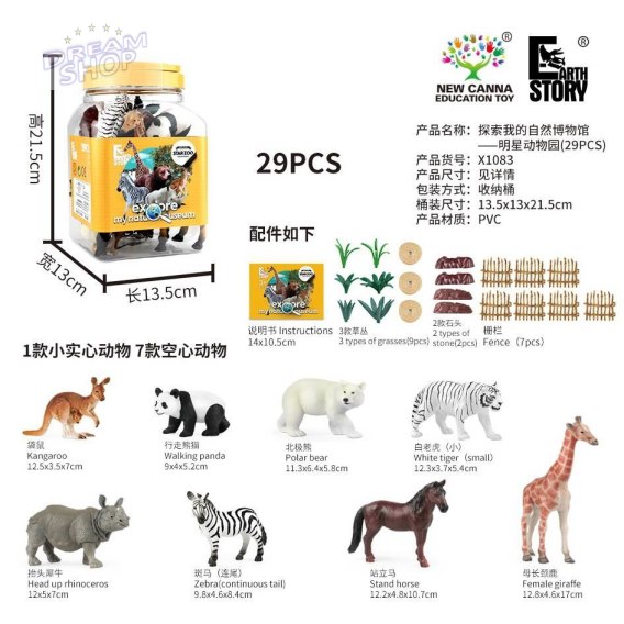 - figurki: kangur, panda, miś polarny, tygrys, nosorożec, zebra, koń, żyrafa,