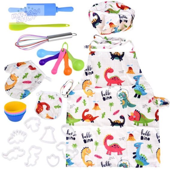 Uroczy fartuszek w dinozaury, kucharza akcesoria do kuchni, szef kuchni, zabawa w gotowanie, foremki, gotowanie, czapka kucharska, wałek, komplet kucharski, mufinka