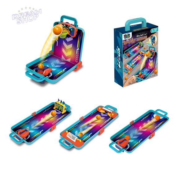 Zestaw gier zręcznościowych 4 w 1 dla dzieci od trzeciego roku życia. Ten niewielkich rozmiarów, zaprojektowany jako kompaktowa walizka zestaw łączy w sobie aż 4 gry: cymbergaj, kręgle, koszykówka i flipper. Dzięki niewielkim gabarytom zestaw można zabrać wszędzie ze sobą i cieszyć się ekscytującą rozrywką tam, gdzie tylko chcesz. Zestaw wykonano z najlepszej jakości materiałów w żywych kolorach. Gra poprawia koordynacje wzrokowo-ruchową, koncentrację i umiejętności motoryczne.