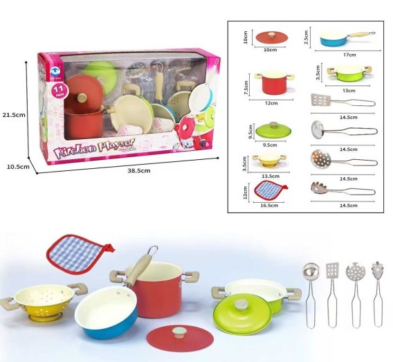 Kolorowy zestaw metalowych garnków i narzędzi kuchennych dla dzieci od 3-go roku życia. Zestaw składa się z 11 elementów takich jak dwa garnki z pokrywkami, cedzak, patelnia, podkładka kuchenna, łopatka, chochelka, łyżka cedzakowa, łyżka do makaronu. Zestaw wykonany został z najlepszej jakości materiałów w żywych kolorach przyciągających wzrok dziecka.