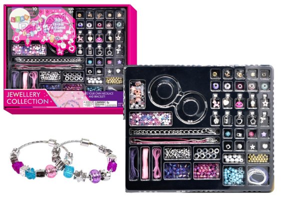 Zestaw do tworzenia biżuterii dla dziewczynek. Zawiera bransoletki, przywieszki, koraliki i sznureczki. Pozwala na projektowanie oryginalnych ozdób, stymulując kreatywność i wyobraźnię dziecka. Estetyczne opakowanie z okienkiem. Idealny prezent!