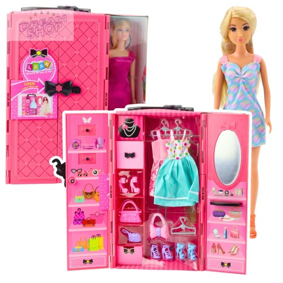 Szafa ma otwierane drzwi, wewnątrz których znajduje się lustro oraz półeczki z akcesoriami. Do zestawu dołączono kolorowe sukienki, buty, wieszaki, a także torebki, które pozwalają na urozmaicenie zabawy i tworzenie niepowtarzalnych stylizacji. Dzięki tak bogatemu wyposażeniu lalka może przygotować się na każdą okazję - od spaceru po eleganckie przyjęcie.