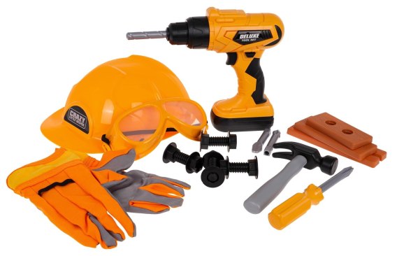 Zestaw małego majsterkowicza z kaskiem i interaktywną wkrętarko-wiertarką dla dzieci powyżej 3-go roku życia. Zestaw wykonano z najwyższej jakości plastiku i zawiera aż 20 elementów. W zestawie znajdują się: kask, rękawiczki, śrubokręt, młotek, okulary ochronne, drewienka do wkręcania, nakładki, śrubki oraz wiertarko-wiertarka z wymiennymi bitami. Wiertarka zasilana jest na baterie 2 x AA 1,5 V (brak w zestawie), posiada efekty dźwiękowe, wkręca i wykręca śruby dołączone do zestawu. Ma wymienne bity oraz wyjmowany akumulator jak w prawdziwej dla dorosłych.