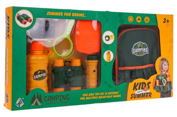Zestaw małego odkrywcy, dla ciekawych świata dzieci od 3-go roku życia. W skład zestawu wchodzi plecak, lornetka, latarka, lupa, pojemnik na napój, pojemnik na żywność, aparat. Plecak zawiera liczne przegródki, tak by mógł pomieścić całe wyposażenie małego odkrywcy. Latarka zasilana jest bateriami typu 2 x AAA 1,5 V (brak w zestawie).
