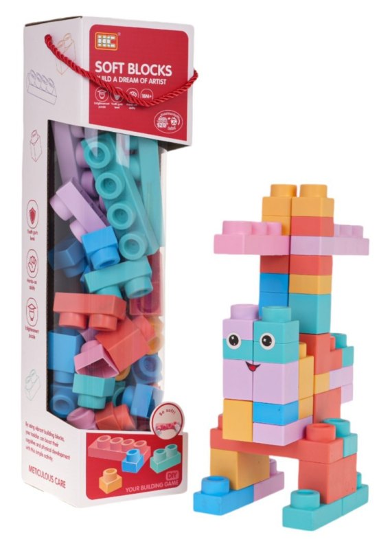 Zestaw kolorowych miękkich klocków dla dzieci od 3-go roku życia. Zestaw wykonanoz bezpiecznego dla dzieci i środowiska materiału PVC. Klocki są lekkie i nie posiadają ostrych zakończeń. Bardzo łatwo je utrzymać w czystości, po wyparzeniu, nie tracą kolorów. Klocuszki możemy dowolnie wyginać, a po wygięciu wracają do swojego poprzedniego kształtu.