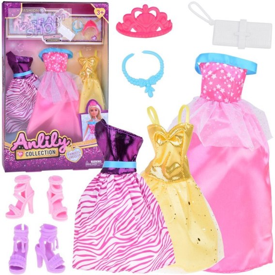 W komplecie znajdują się trzy różne sukienki - każda o unikalnym kroju i kolorystyce, dzięki czemu można tworzyć różnorodne stylizacje, dostosowane do każdej okazji. Dwie pary eleganckich butów na obcasie dodają szyku i klasy, a dopełnieniem całości są: efektowna torebka, niebieski naszyjnik oraz delikatna korona - idealna dla każdej małej księżniczki.