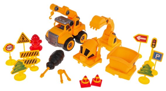 Zestaw pojazd budowlany 4 w 1 z akcesoriami dla dzieci od 3 -go roku życia. Zestaw wykonany został z najwyższej jakości plastiku. Dzięki wymiennym elementom autko budowlane możemy przekształcić lub rozłożyć na czynniki pierwsze. W zestawie znajduje się śrubokręt z wymiennymi nasadkami.