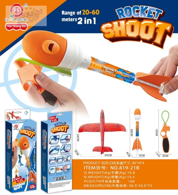 Idealny zestaw do zabawy na świeżym powietrzu, lekki, aerodynamicznie ukształtowany samolot, proca i rakieta dla dzieci od trzeciego roku życia. Samolocik wykonano z lekkiego styropianu, jest wytrzymały, a dzięki swej lekkości po wystrzeleniu może przelecieć 20 do 60 metrów. Rakieta posiada gumowe zakończenie, co zwiększa bezpieczeństwo jej używania. Do zestawu dołączona jest proca z gumką. Wystarczy zaczepić gumkę o element samolotu lub rakiety i wystrzelić je na dużą odległość. Wspaniała zabawa gwarantowana. Zestaw nie posiada ostrych krawędzi, jest łatwy w użyciu i bezpieczny dla dzieci. Rakieta zasilana jest bateriami (w zestawie). Po uderzeniu w cel jej korpus rozświetla się kolorami. W górnej części rakiety jest też gwizdek.