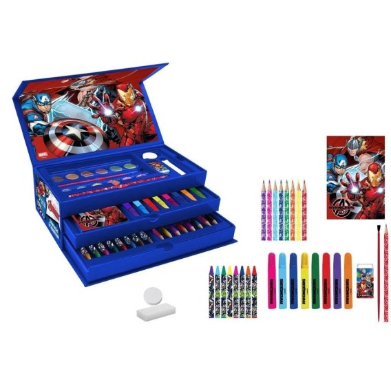 Zestaw przyborów dla małego artysty zapakowany w ozdobne pudełko-kuferek. Ma rączkę do wygodnego przenoszenia i 2 wysuwane szufladki. Zestaw zawiera: - 8 kredek ołówkowych - 8 kredek świecowych - 8 pisaków - 12 farbek wodnych - pędzelek - gąbeczkę - 2 gumki do mazania - ołówek - kolorowankę w formie notesika