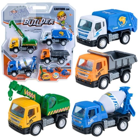 Taki skład pojazdów zadowoli każdego małego miłośnika pojazdów budowlanych. Pojazdy dzięki małym gabarytom świetnie nadadzą się do małych rączek dzieci. Są bardzo poręczne, wszędzie się zmieszczą i można je zabrać ze sobą na spacer lub do przedszkola. Zestaw 4 starannie wykonanych pojazdów zadowoli każdego małego inżyniera. Zabawka z ruchomymi elementami (kiper, otwierane drzwi) samochód napędzany mechanizmem typu Friction power, czyli rozpędzany poprzez poruszenie zabawki na gładkiej powierzchni.