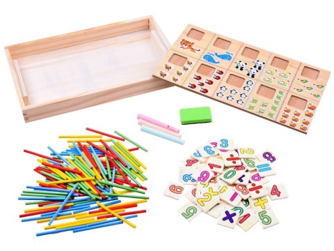 Edukacyjny zestaw do nauki matematyki sprawdzi się podczas pierwszych matematycznych kroków. Zestaw w całości wykonany jest z drewna, w formie zamykanego pudełeczka. Jedna strona zasuwy jest przeznaczona do pisania kredą, druga strona to obrazki ze zwierzątkami i cyferkami.