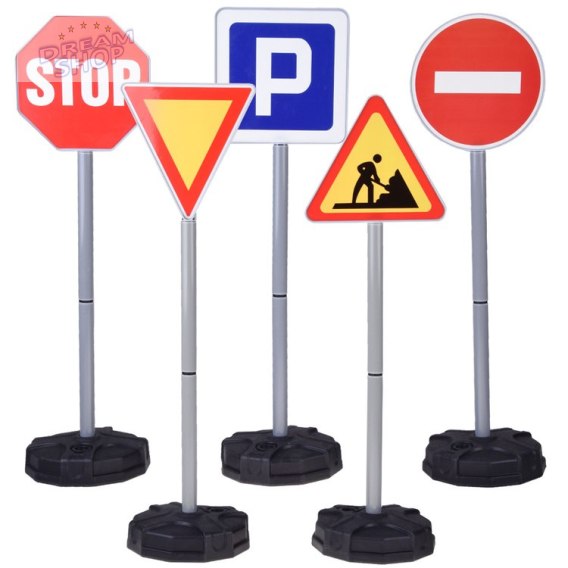 W zestawie znajduje się 5 popularnych znaków drogowych: