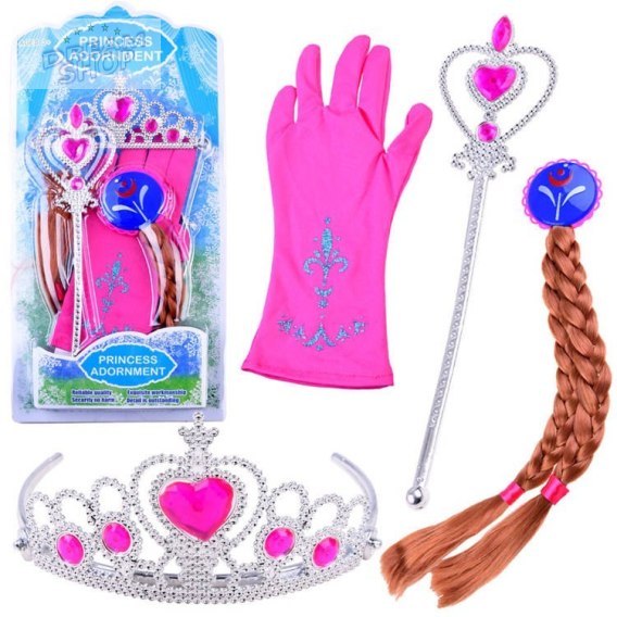 Magiczny zestaw księżniczki z bajki, pomoże stać się każdej dziewczynce prawdziwą królewną. W skład zestawu wchodzi spinka z warkoczem, korona, berło oraz pięknie zdobiona rękawiczka. Granatowa ozdobna spinka z klipsem, z doczepionymi długimi kasztanowymi warkoczami, jest łatwa do założenia, a co najważniejsze pomoże upodobnić się do pięknej księżniczki z popularnej bajki. Korona oraz berło to obowiązkowe akcesoria każdej królowej, księżniczki lub królewny dlatego zostały misternie wykonane i pięknie ozdobione różowymi kryształkami z plastiku. Różowa rękawiczka z pięknym eleganckim zdobieniem pięknie dopełni strój małej dziewczynki. Wszystkie elementy zestawu są bezpieczne, elementy biżuterii zostały wykonane z plastiku, a rękawiczka z poliestru, natomiast włosy z tworzywa sztucznego.