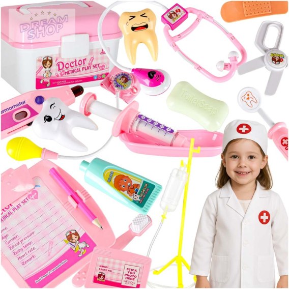 Uroczy zestaw małego lekarza z kuferkiem w kolorze biało-różowym da dziecku sporo możliwości kreatywnej zabawy. Do dyspozycji są akcesoria lekarza pierwszego kontaktu, dentysty oraz pielęgniarki.