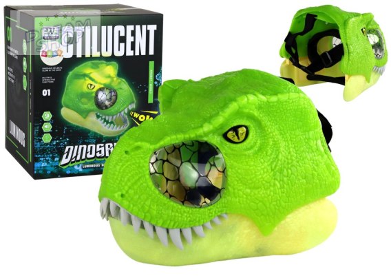 Maska Dinozaura w kolorze Zielonym. Delikatne uchylenie paszczy wydaje dźwięki, otwarcie w pełni powoduje intensywny ryk i świecące oczy. Regulowana opaska zapewnia idealne dopasowanie. Maska wykonana z fluorescencyjnego materiału.