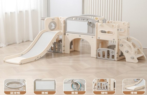 Zestaw 5w1, zjeżdżalnia, koszykówka, tablica do rysowania, gra zręcznościowa rzut obręczami, bramka, dla dzieci od 1-go roku życia. Wszystkie elementy zestawu wykonane są z wysokiej jakości materiału HDPE, który jest materiałem bardziej elastycznym i odpornym na uszkodzenia mechaniczne w porównaniu z materiałami wykorzystywanymi w innych tego typu konstrukcjach. Duże elementy składowe ułatwiają montaż. Zestaw idealnie sprawdzi się na zewnątrz czy w pomieszczeniu.